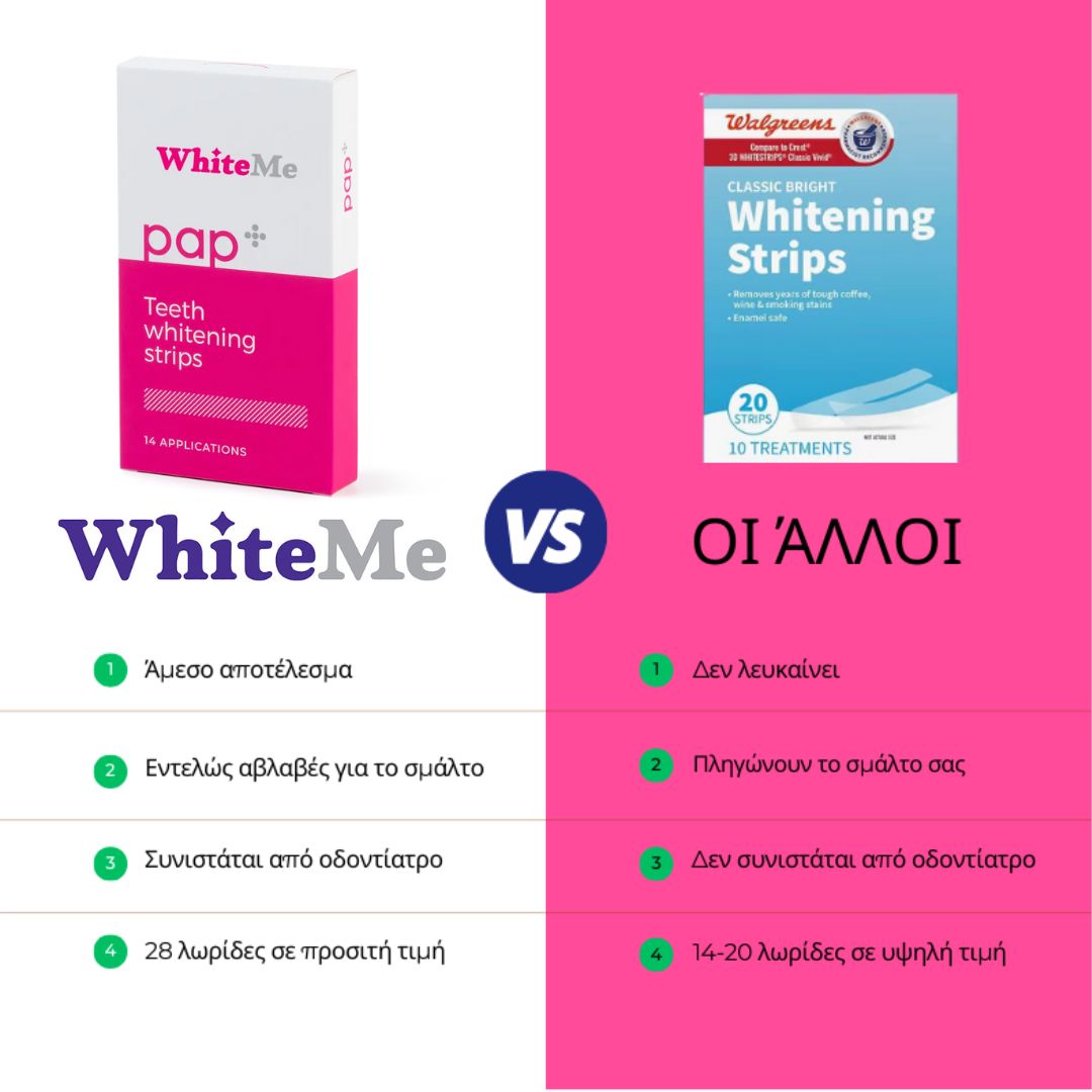Το WhiteMe - PAP+ (λευκαντικές ταινίες) είναι ένα επαναστατικό προϊόν που έχει σχεδιαστεί για να σας βοηθήσει να επιτύχετε τέλεια λευκά δόντια στην άνεση του περιβάλλοντος του σπιτιού σας. Αυτές οι εξαιρετικά αποτελεσματικές ταινίες PAP+ χρησιμοποιούν μια καινοτόμο φόρμουλα που έχει αναπτυχθεί από ειδικούς στον κλάδο της οδοντιατρικής περίθαλψης.